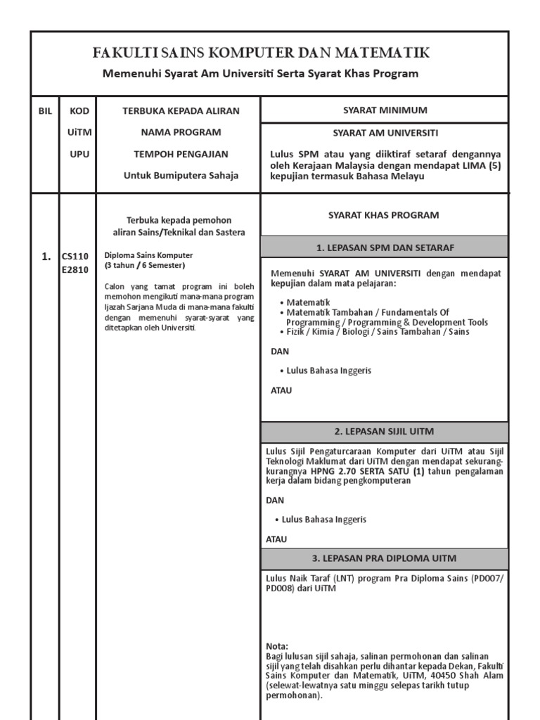 Diploma sains komputer uitm di mana. Pi baca kat page MARAbyk dh mara tolong n offer dari zaman belajar di mrsm lgielts exam tak lepas utk program overseaso mara offer program dlm negeri dgn pinjaman bersyarat tp adik ni tak mahu katanyamaybe prefer biasiswabersyukur la dik skrg ni dpt offer pinjaman bersyarat pon student dgn parent dh cukup. Pra Diploma Sains PD008.